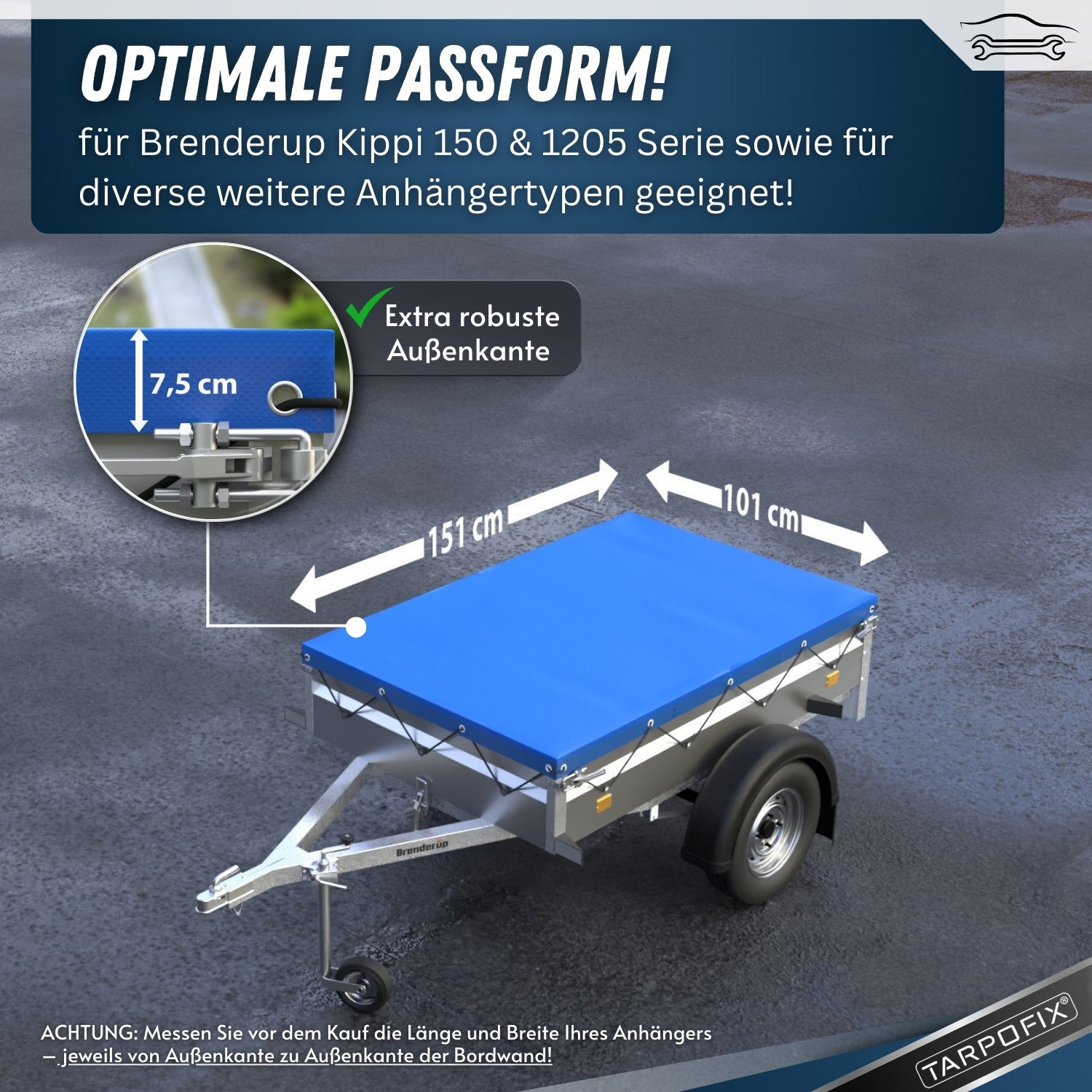 Die Hängerplane passt auf alle oben genannten und sonstigen Baumarktanhänger Modelle mit Kastengröße: