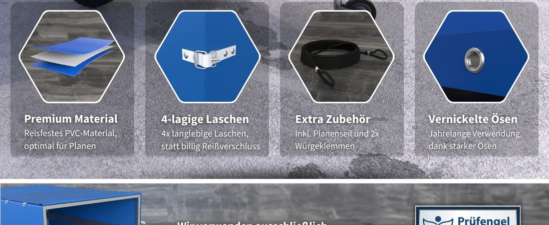 Die Plane besteht aus strapazierfähigem PVC und ist mit einem robusten Ø8mm Gummizug sowie verstärkten, vernickelten Ösen ausgestattet.
