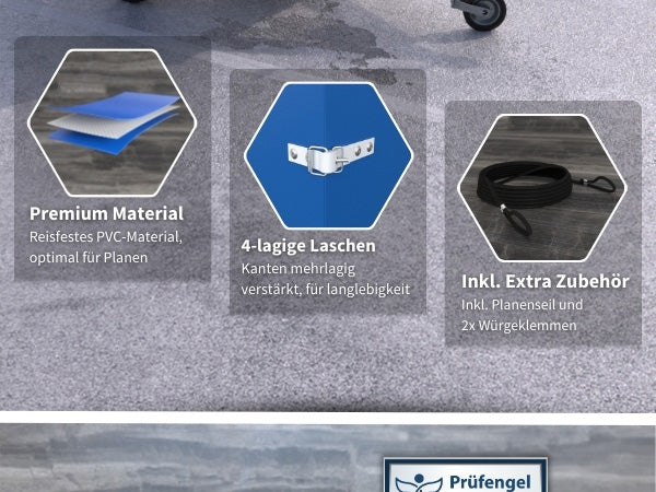 Dank doppelt gefalztem Material und hochtemperiert verschweißten Kanten ist die Plane besonders langlebig und widerstandsfähig gegen typischen Verschleiß.