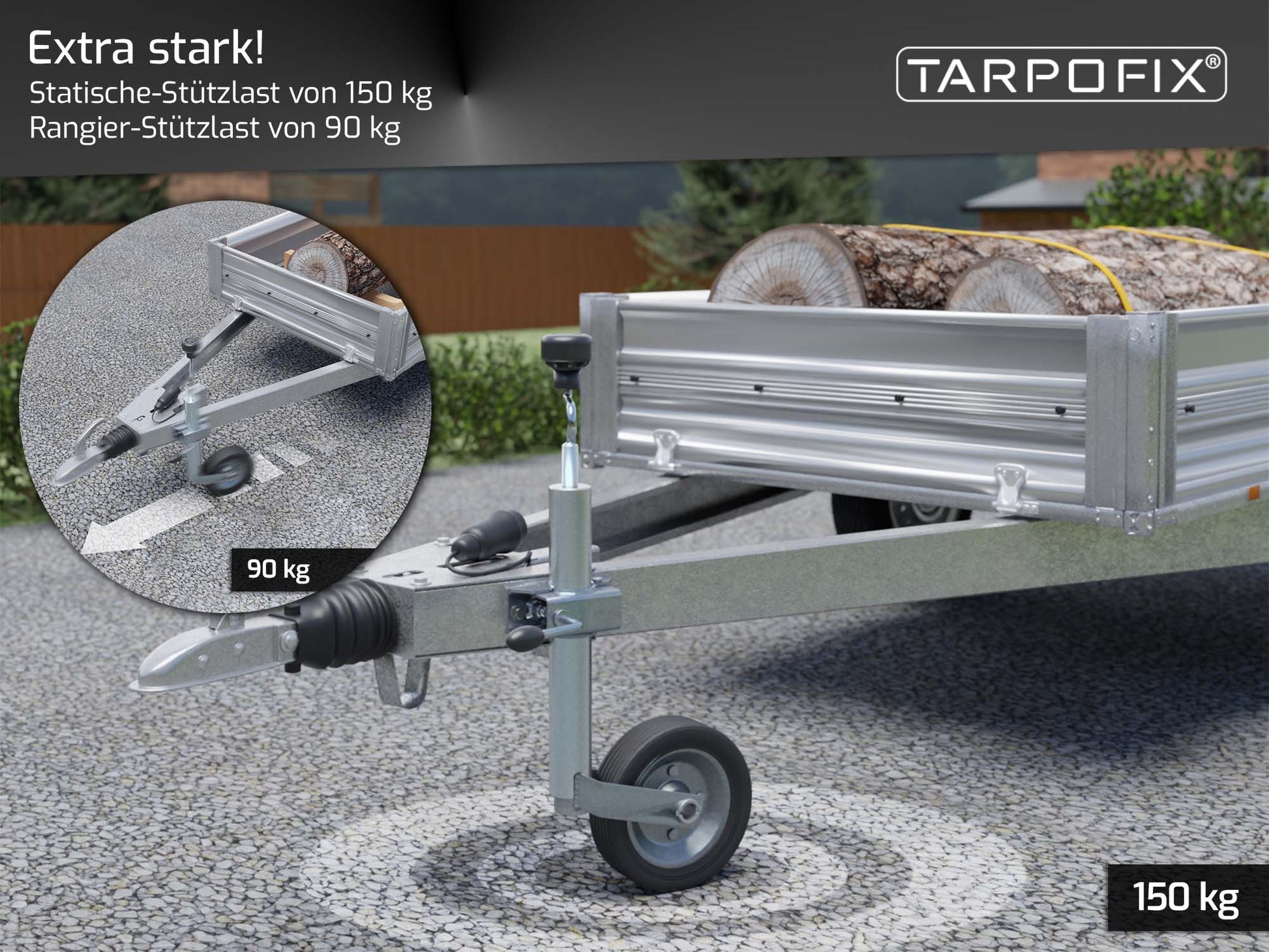 Das Stützrad kann eine statische Last von bis zu 150 kg und eine Rangierlast von bis zu 90 kg tragen. Die Anhängerstützen können jeweils bis zu 300 kg tragen, insgesamt also 600 kg bei zwei Stützen.