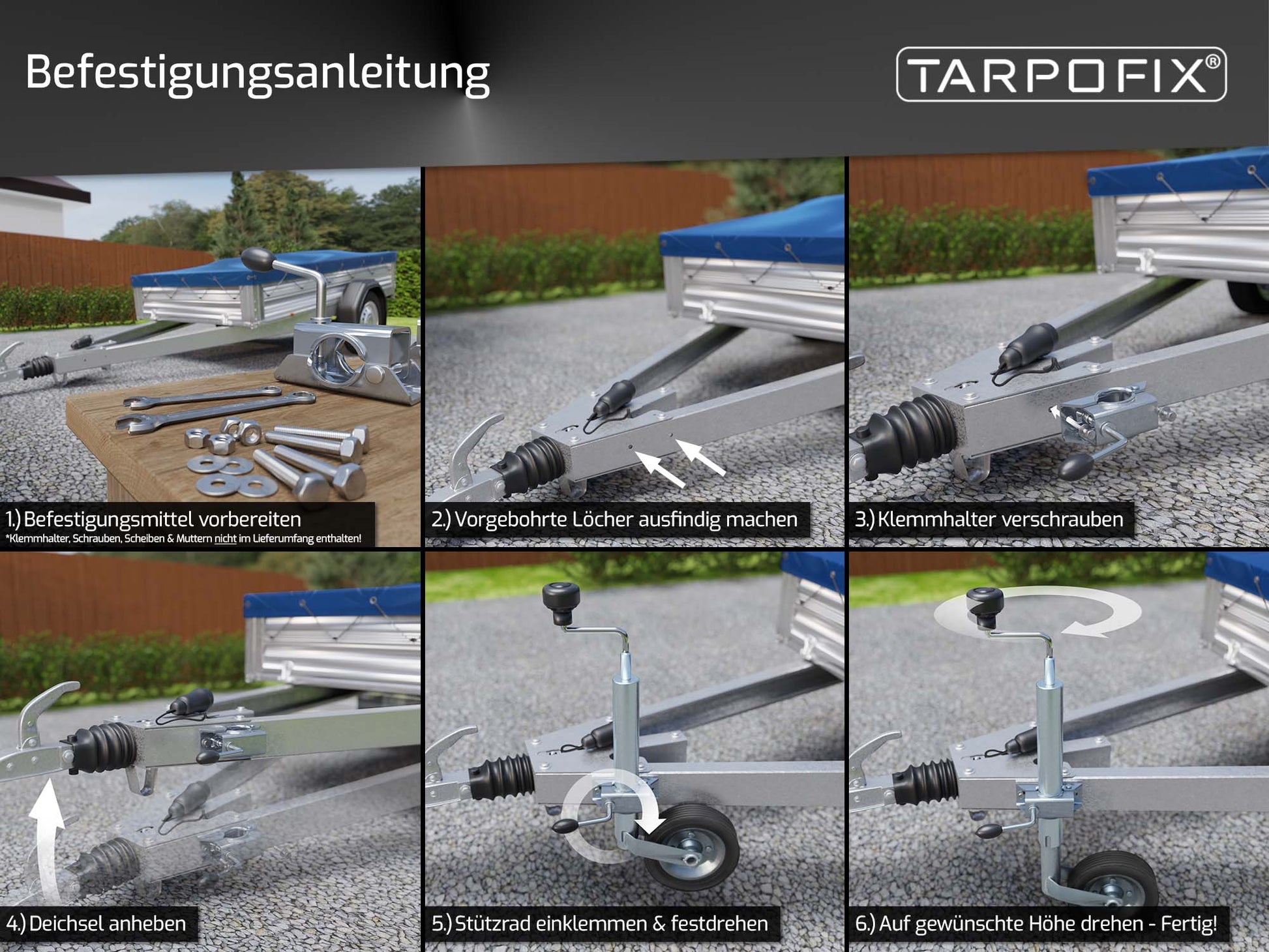 Ja, das Stützrad ist höhenverstellbar von 460 - 680 mm und passt auf verschiedene Anhänger. Die Anhängerstützen sind 600 mm lang und können leicht an die meisten Anhänger angepasst werden.