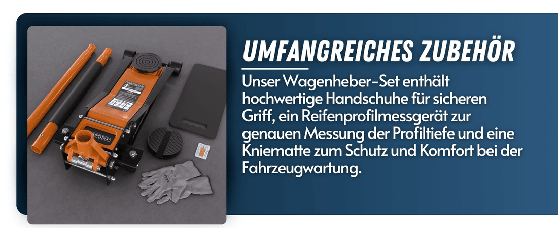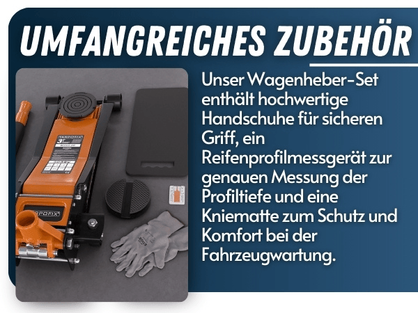 Ja, der Wagenheber wird mit Schutzhandschuhen, einer Knieschutzmatte und einem Reifenprofil-Tiefenmesser geliefert, um deine Arbeit sicherer und komfortabler zu gestalten.